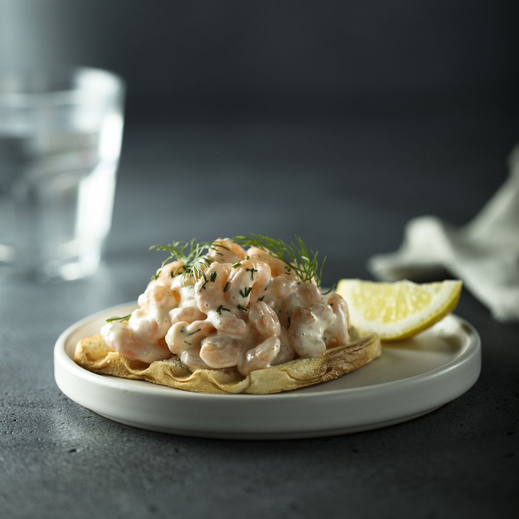 - Vänd försiktigt ner räkorna i dressingen tills allt är väl blandat.